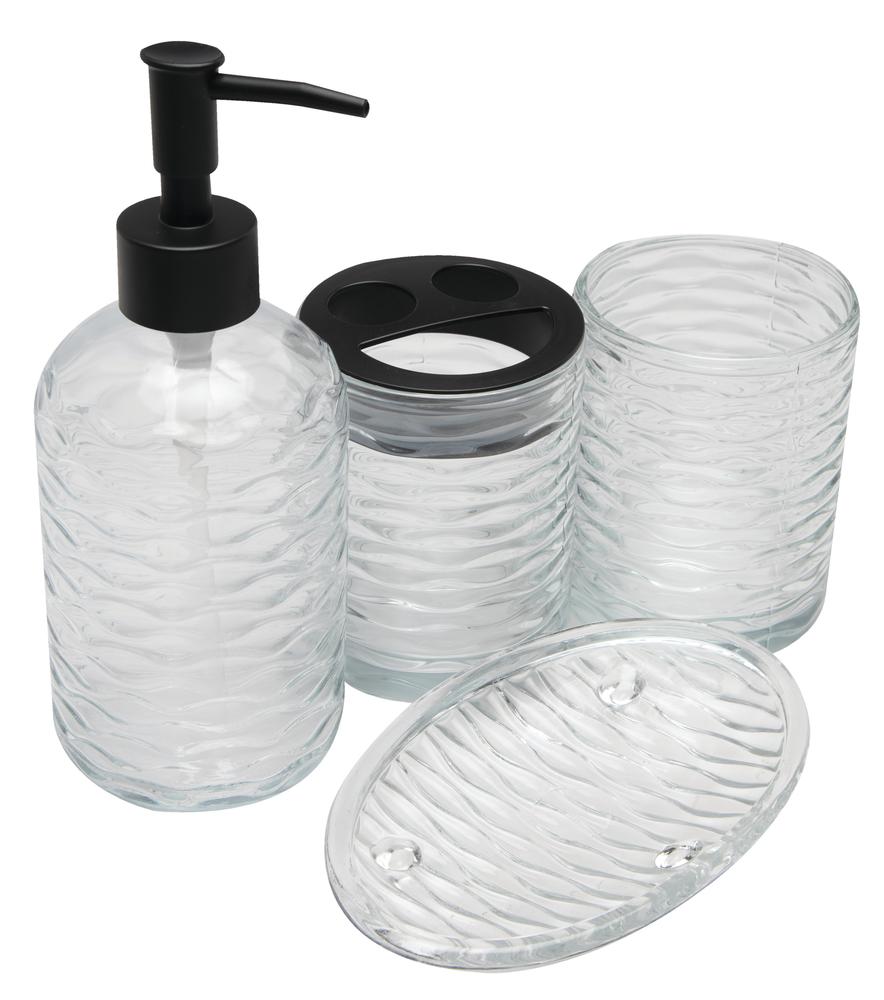 Elevate your bathroom décor with this elegant and modern 4-piece bathroom accessory set. Featuring a stylish rippled glass design, this set adds a touch of sophistication while keeping your essentials organized and within reach.