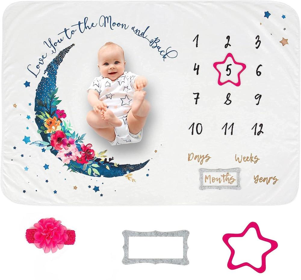Featuring a beautiful flowery frame design, this blanket comes with two milestone markers and a floral headband, adding a charming touch to your baby's milestone photoshoots.