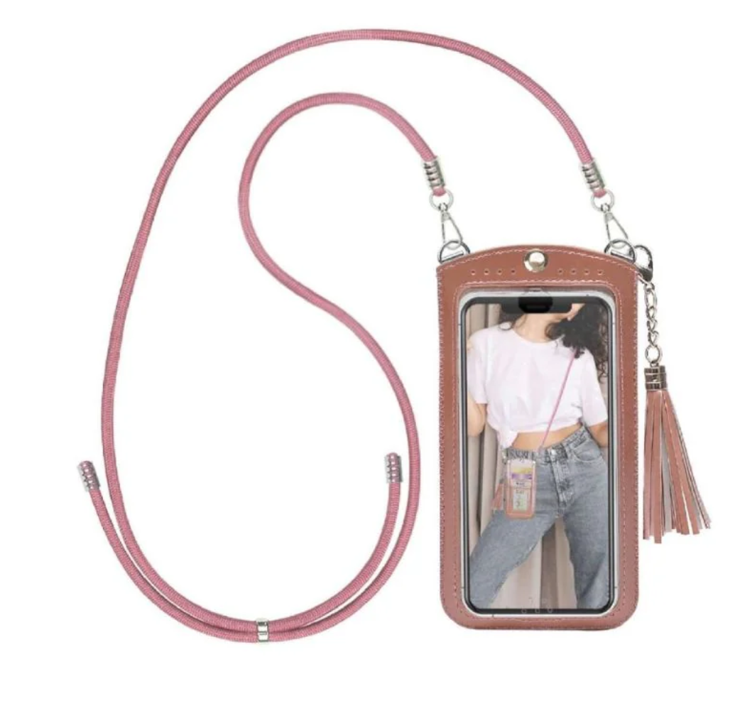 Stay stylish and hands-free with this Pink Cell Phone Purse! Designed with convenience and fashion in mind, this crossbody phone holder features a transparent touchscreen window so you can use your phone without removing it from the case. The adjustable pink strap lets you wear it around your neck or across your body for easy access on the go. Accented with a matching tassel charm, this lightweight purse is perfect for shopping, festivals, travel, or daily errands. Fits most smartphones and even has room for your ID or cards inside!